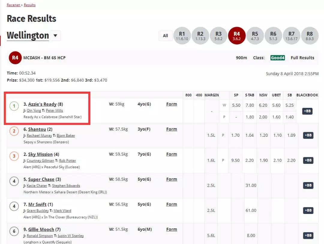 据第一赛马网获悉,当地时间今天(4月8日)下午2点55分,在澳大利亚新南威尔士州Wellington赛马场举行的一场总奖金为34,300澳元的比赛(MCDASH - BM 65 HCP)中,赛驹Azzie's Ready 击败其余8匹对手马夺冠,为幕后团队赢回19,556澳元头马奖金。值得一提的是,今日助力Azzie's Ready夺冠的鞍上人为中国骑师覃勇( Qin Yong),这也是中国骑师在澳洲赛场上赢得的首次胜利。