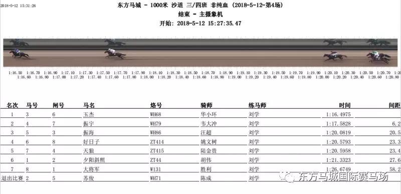 第四仗伊犁马千米赛事,闸门打开首先“振宇”、“振海”、“玉杰”、“夕阳斜照”四驹并驾齐驱 互不相让。“好日子”于第二集团奋力追赶,入弯阶段“玉杰”凭借内栏优势率先取得领先大步向前。侧方“振宇”亦不屈服,奋起直追,奈何马匹于三百米处向内栏斜跑,待骑师矫正后已错失追赶良机屈居第二。“玉杰”则稳扎稳打以6个马位优势夺冠,“振海”后力不济取得第三。