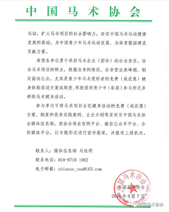 为响应国家体育总局关于“贯彻落实、全面推进实施全民健身国家战略”的号召,进一步加强青少年马术运动的推广和普及,经中国马术协会研究决定,在8月8日“全民健身日”来临之际,面向各省市马术协会、马术俱乐部及马术相关机构发出以下倡议: