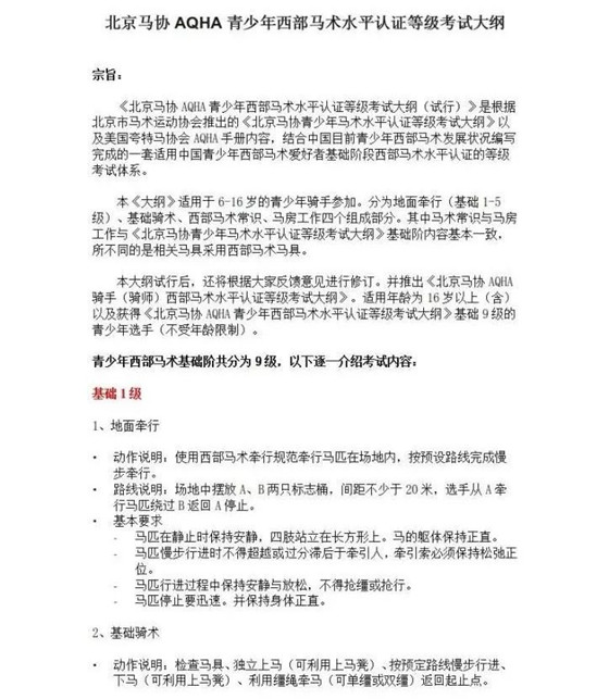 获取北京马协青少年西部马术水平认证等级考试大纲(试行)链接请点击底部“阅读原文”