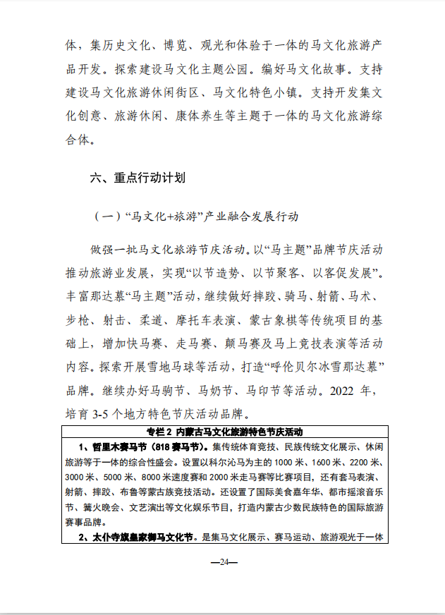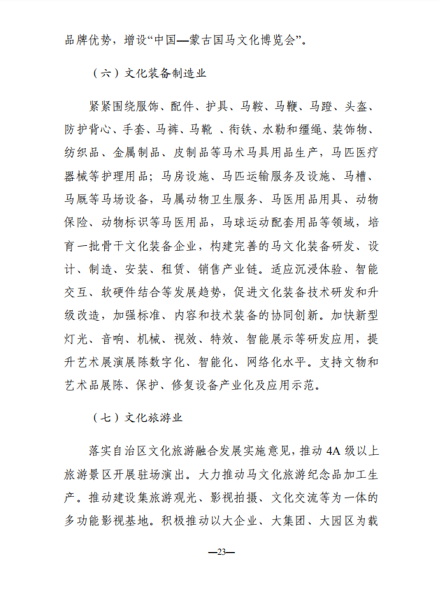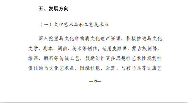 本次《征求意见稿》较之前的《若干意见》内容更为详实,明确了总体发展方向和重点行动计划。发展方向分别有:文化艺术品和工艺美术业、文化创意设计业、网络文化业、文化演艺业、文化会展业、文化装备制造业、文化旅游业七个方面。重点行动计划包括:“马文化+旅游”产业融合发展行动、“马文化+体育”产业融合发展行动、“马文化+健康”产业融合发展行动。可以说,此次《征求意见稿》是内蒙古自治区马文化一次非常细致的规划和落地。