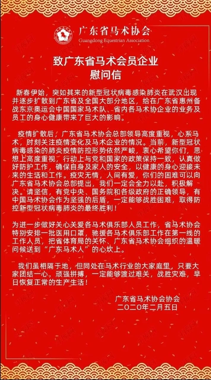 2月5日,广东省马术协会会向广东省工作在马术场第一线,特别是在广东省惠州备战东京奥运会的中国国家马术队发出慰问信,表达广东省马术协会对他们的衷心感谢和诚挚问候。 广东省马术协会特别安排一批医用口罩,驰援各马术俱乐部的工作在第一线的工作人员,把省体育局的关怀、广东省马术协会组织的温暖问候送到“广东马术人”的心坎上。