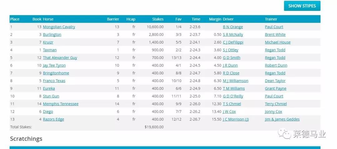 2020/2/14日,莱德马业赛驹参加新西兰一场1980M路程的轻驾车比赛、精彩赢得19,600新币的奖金,“蒙古铁骑”因闸位排在最后的13号档,出闸时跑在后端位置,当第二个弯道过后“蒙古铁骑”从大外档开始追赶占据了中端位置,在最后弯道时“蒙古铁骑”从中端位置发力冲刺最终精彩获得本场比赛的胜利。