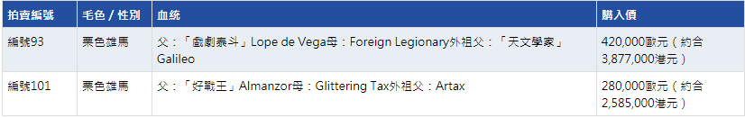 此外,马会以二十八万欧元(约合226.7万元人民币)投得编号101幼马。此驹属“好战王”(Almanzor)首批周岁子嗣之一。首季种马“好战王”曾于2016年荣膺欧洲最佳三岁雄马,先后攻下法国打吡大赛、爱尔兰冠军锦标和英国冠军锦标三项一级赛,在该年度浪琴表世界马匹排名获评129分,成为当年最高评分的欧洲赛驹。