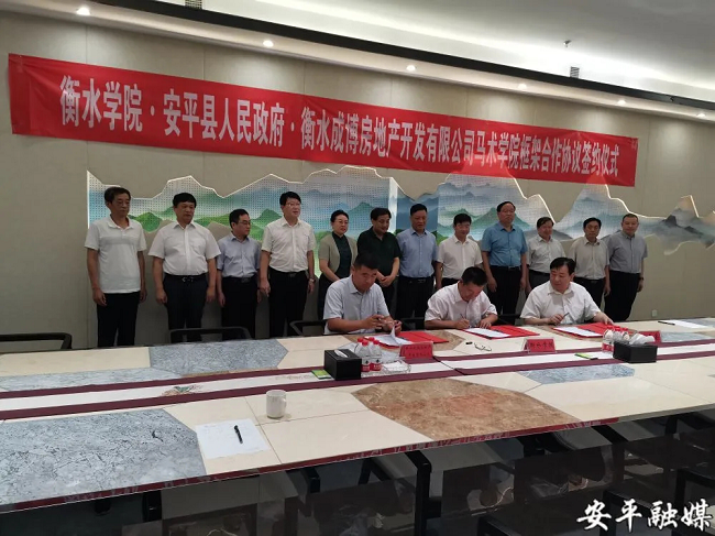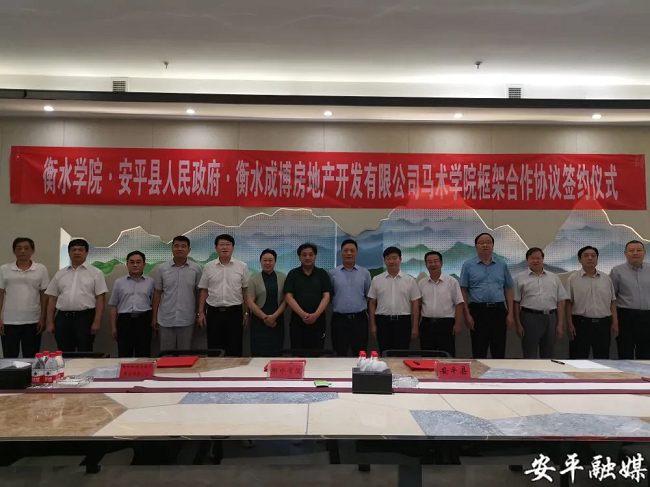 2020年6月27日上午,“衡水学院马术学院”框架合作协议签约仪式在安平县市民文化体育活动中心会议室成功举行,市人大常委会、市政府、衡水学院、衡水成博集团、安平县委县政府等有关领导出席仪式。衡水学院体育学院及市、区、县相关部门负责同志参加仪式。这既是一次高校学科建设、名企拓展领域和地方产业培育的“联姻”,更是一次三方共赢、共同发展的战略之举。标志着安平县教育事业迈向了更高水平,也使安平成为了全市唯一拥有本科院校的县,为推动马文化、马运动、马科学融合发展,做大做强现代马产业提供专业人才储备。