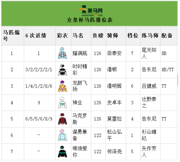 根据所公布的排位表,在总奖金高达二千五百万港元的富卫保险女皇杯(2000米一级赛)中,备受关注的日本三冠马后“谋勇兼备”将在骑师松山弘平胯下从1号闸起步,与2号档的应届香港马王“时时精彩”同场竞逐,“时时精彩”本场将由骑师潘顿策骑出赛。