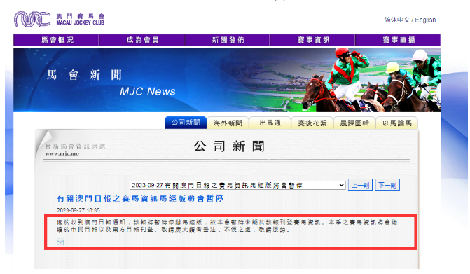 近两年澳门赛马会引进一匹内地人士,如陕西李勇、河北范云鹤、浙江永兴侯兴建、华宇黄庆才,以及夏辰宇、董伟、董恩喜等,在澳门马会买马当马主,试图挽救颓势,但是终究未见成效。今年7月份,一批载有30匹马的航班计划由悉尼前往澳门,但被当地政府拒绝入口,最终只能返回原地。随后,港媒报道称,澳门政府由2023年8月起,将暂进禁止限制新马入口。消息一出,澳门赛马会的未来走向纷纷引起马圈人士的关注,相关人士对澳门政府是否有意收回澳门赛马会举办赛马的牌照感到忧虑。据称,澳门政府此举是为了制裁澳门赛马会未能如期兑现约定。2018年澳门政府与澳门赛马会签订续约赛马专营合同获延长至2042年8月31日。合同增加的附录内容,包括须按规定期限完成投资方案所载的12项建设项目。澳门赛马会若未按规定完成相关投资建设项目,则视为违反合同,特区政府可中止赛马专营批给或解除赛马专营批给合同。但五年过去,澳门赛马会未能如期兑现部分承诺,澳门政府所以作出此项制裁决定。同时,澳门政府还将与澳门赛马会重新讨论续牌问题。(相关阅读:【重磅】亏损36.72亿,禁新马进口,澳门赛马还能撑多久?!)不过,所有的传闻最终于澳门新马季开锣前得到澄清。据报道,2023/2024年度马季赛期表已获澳门政府批准,2023/2024年度马季 于2023年9月29日(星期五)晚开锣。澳门赛马会官网也已经更新了新马季的赛期表,以及发布了赛事的相关信息。不过,今年9月底,澳门赛马再传不利消息。当地最具影响力报纸《澳门日报》向澳门赛马会表示会暂停马经版。此消息一出,澳门赛马再度阴云笼罩。