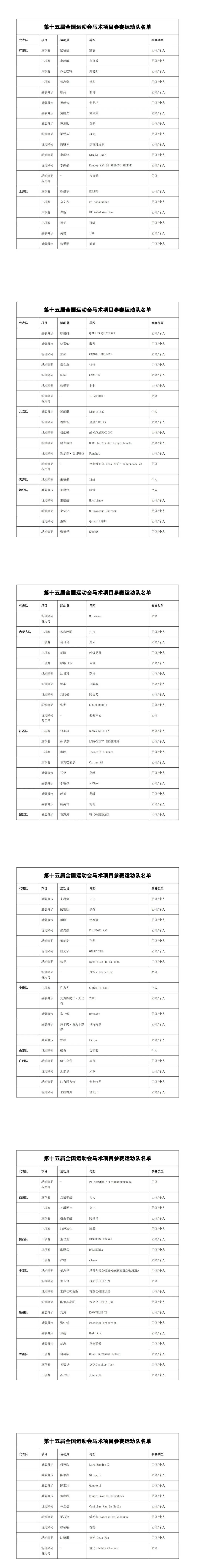 第十五届全国运动会马术项目将于11月10日至19日在深圳光明国际马术中心及科学公园(三项赛越野赛段)展开终极对决。随着各参赛队伍陆续抵达赛场,十六支代表队的豪华阵容正式揭晓。来自北京、河北、内蒙古、上海、江苏、浙江、安徽、山东、广东、广西、西藏、陕西、宁夏、新疆、香港及广东的89名顶尖骑手,将向盛装舞步、三项赛、场地障碍三个项目的六枚金牌发起冲击。