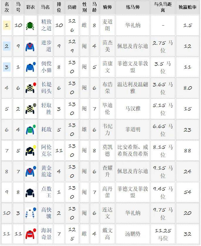 尽管赛道泥泞、天气恶劣,这匹“灯塔岛” (Fastnet Rock) 的杰出子嗣仍以1.70倍大热门姿态出战,全程未让马迷失望。麦道朗在主场直道顶端将“精致之道” (Via Sistina) 移至空敞位置,尽管“进步道” (Zambardo,16倍) 与“倜傥小猫” (Tom Kitten,9倍) 奋力追赶,始终未能威胁这匹超级母马的领先地位。