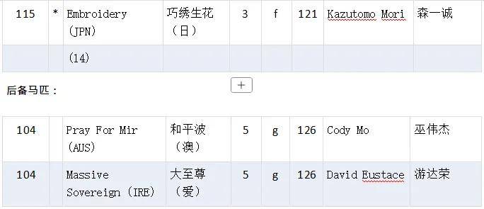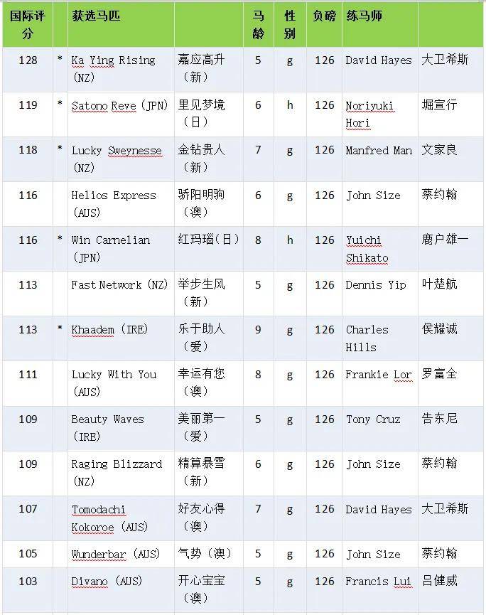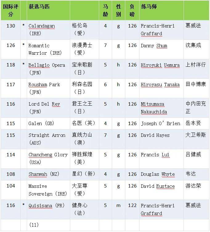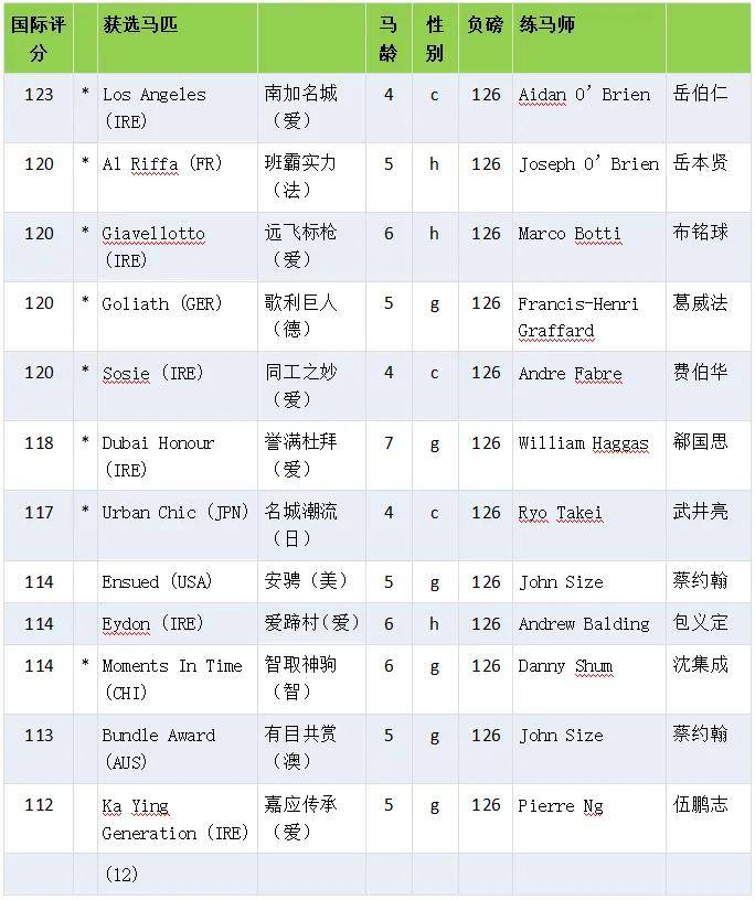 * 曾胜出一级赛的马匹g – 阉马; c/h – 雄马; f/m – 雌马