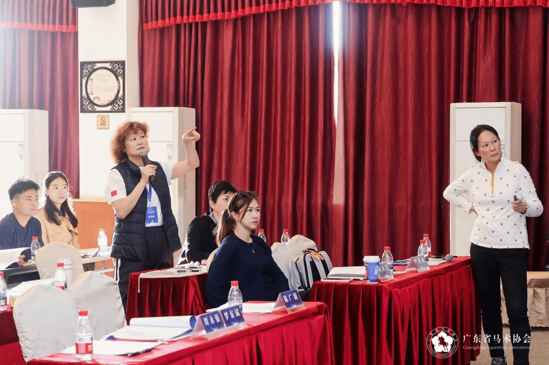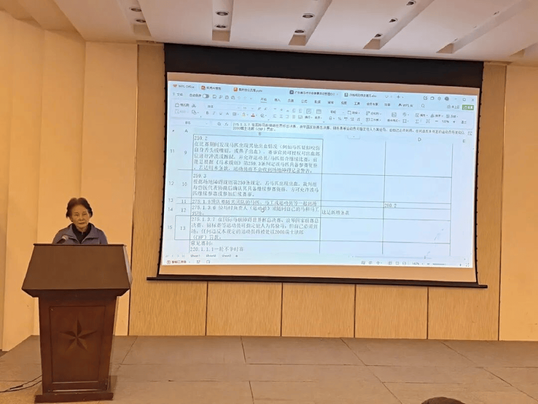 图:国际马联裁判严秀英老师在会上与裁判员解析《广东省马术联赛规程(2026年征求意见稿)》