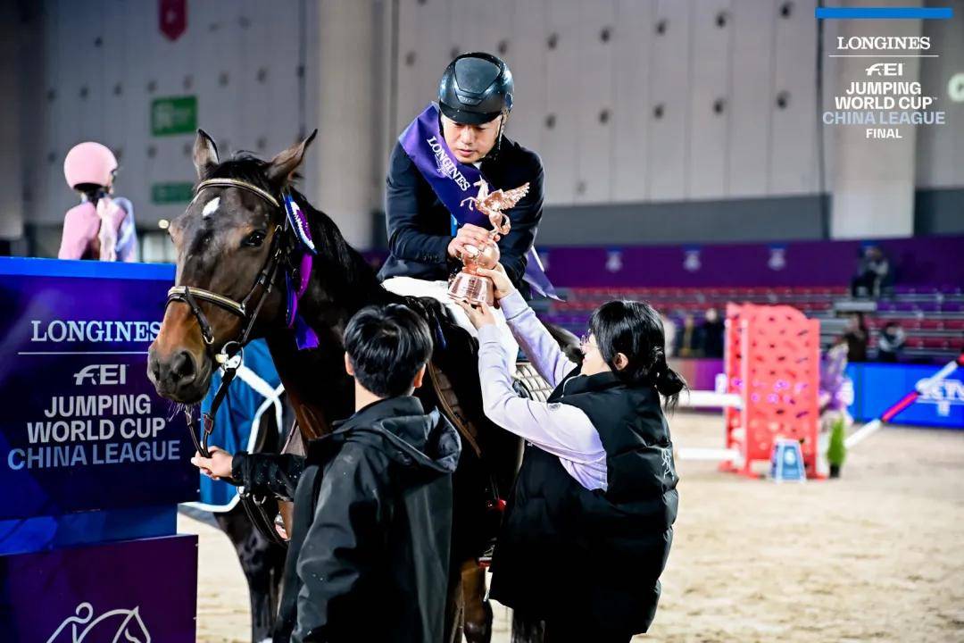 图:中国骑手朱熙之与马匹内尔在马背上接受颁奖