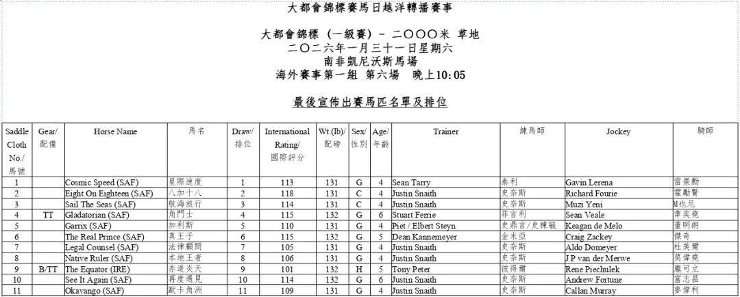 大都会锦标赛(2000米)将于本周六(1月31日)在南非凯尼沃斯马场举行。练马师史奈斯此次将强势出击,麾下三匹精英均具备夺冠实力,但他仍将卫冕冠军“八加十八”(Eight On Eighteen ,南非))视为最有力的争冠希望。