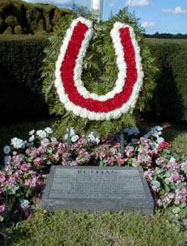 1975年7月6日,伟大对决(Great Match)的日子。两驹在开始阶段便全力奔跑,首段1/4英里(约402米)用时22又1/5秒,超快的速度。但谁知就在跑过600米处没有多远,骨头碎裂的声音提前结束了这场万众瞩目的比赛——Ruffian右前脚前端籽骨骨折。强烈的斗心驱使着这匹不败的女王继续奔跑,使得伤势恶化,虽然赛后进行了手术,但剧烈的疼痛让Ruffian再度弄伤患处,最终不得不人道毁灭。Ruffian被埋在贝蒙赛马场旗杆的下面,鼻端朝着终点线的方向,没有别的赛马能享受如此荣誉,自此之后北美地区也再无纯血马单打独斗的比赛。2007年,Ruffian的故事被拍成影片,以纪念这匹伟大的赛马和那个年代,中文片名译作《英雄“暴徒”》,可惜暂时在中国没有找到片源,只能提供一张Ruffian的墓碑图片……