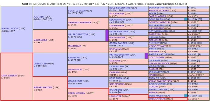 2006年4月1日愚人节这天,Phipps Stable卖出一匹已经受孕的母马Supercharger。当其第二年产下Maria's Mon的儿子的时候,谁也没有想到,3年之后,这匹骝毛小马成为了2010年肯塔基德比大赛的冠军。马主给它起了个十分恰当的名字:Super Saver(港译:大超值)!确实超值呀,只是在回忆到当初为什么要卖出Supercharger时,Ogden Mills Phipps还有些无法掩饰的遗憾。同样的事情险些再次上演,当Ogden Mills Phipps想要出售母马Lady Liberty时,Seth W. Hancock阻止了他。后来Stuart Symington Janney III将这匹母马与Malibu Moon配种,后来就有了这匹Orb(港译:宝球)。