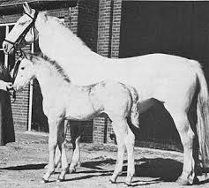 而世界上最早诞生的白毛牝马是1914年出生在英国,不过很可惜这匹马没有登记在册。而公认最早的白毛牝马是以下图片中的这个匹马“Woher”,其父Pergolese(青鹿毛),其母Lonja(鹿毛),1925年出生在德国,是明确记录在案,既是欧洲大陆上也是世界上最早的白毛牝马。一匹完全突然变异的白毛马。另外,做为白毛牝马产下的也是白毛马,是世界上最早的白毛马母女俩,1952年出生在荷兰。