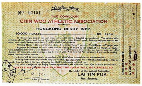 1927-03-01 已有九龙精武体育会发行 1920年代 香港打吡大赛马票