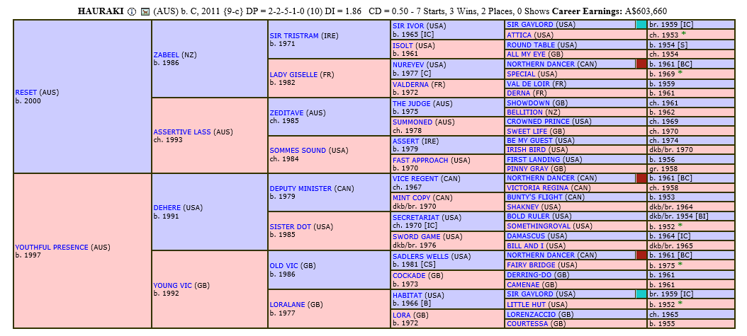 Hauraki是2015澳大利亚BMW一级赛冠军,大家看看Tessa Gillian和Royal Charger是全兄妹,父尾线Royal Charger,即是Habitat, Sir Tristram/Zabeel, Turn To/Sunday Silence的祖先,所以如果尾母线有Tessa Gillian或后代Eight Carat等的马母,这是配种出好后代的一个好基础!