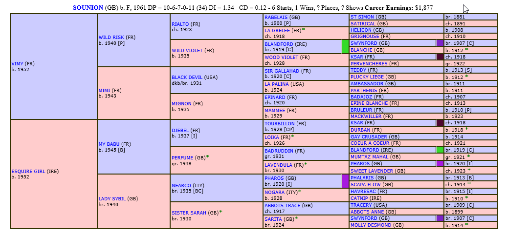 英国2015橡树大赛冠军Qualify,血统特点是经Sounion母尾线Sister Sarah,Sister Sarah 是母尾线Pretty Polly, Pretty Polly生于1901,是英国20世纪最好成绩的母马!而Northern Dancer 的父亲Neartic就是母尾线Sister Sarah。当整个血统图父尾线和母尾线有同一个祖先,效果是很显著的。我之前说过,第一二代母亲往往要有好的赛马成绩才能遗传,但是如果尾母线有很显赫的祖先,很多时候隔多几代也会出现很厉害的马匹,而Pretty Polly/Sister Sarah尾母线后代在南非也出现过Soul和她家族很多顶级级赛马!