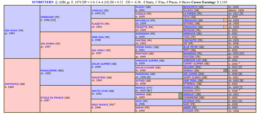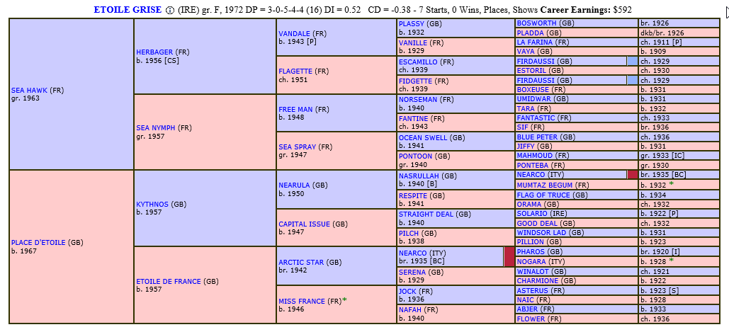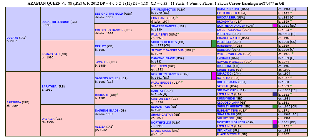 Arabian Queen是2015英国Juddmonte International 冠军,击败之前没有输过的Golden Horn,血统里面尾母线的Etoile Grise和Sunbittern是3/4血缘姐妹!它的血统里面还有Shirley Heights 4x5,Shirley Heights的近亲交配是非常厉害的,我会在以后用实际数据显示。而且Shirley Heights和SadlersWells是非常合拍的,如果说AEI(Average Earnings Index)有两倍已经是超凡,这组合达到4倍AEI,是非常厉害而且罕见的!