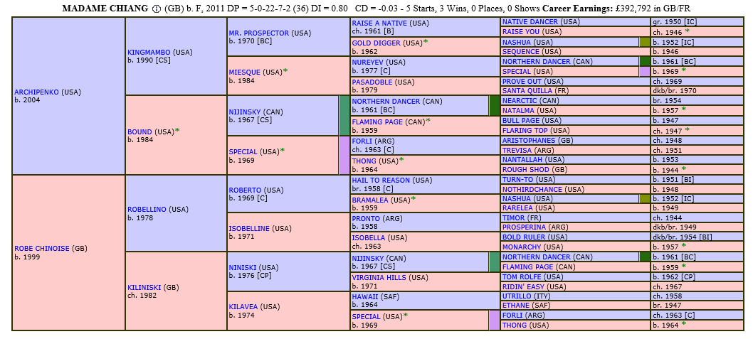 最后一个例子是Madame Chiang, 就是去年Champion Stakes 母马冠军,大家都知道公马冠军是Frankel,所以我拿这些今年或去年的世界最大一级赛例子都是想表达近亲交配(inbreeding),特别是母尾线的厉害!很多时候这出现在最顶级的冠军马匹中!