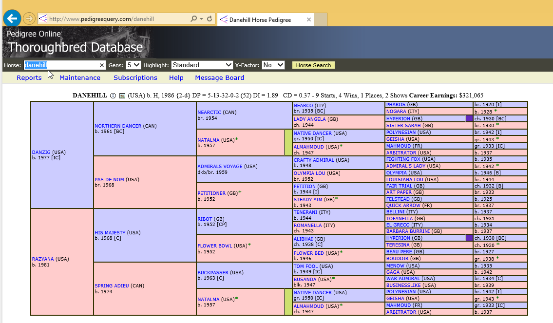 我用“丹山”做例子,图片2有丹山的5代祖先,顶部写着“丹山”Danehill的名字,后面的文字是指:USA美国出生;b.代表颜色:bay;H代表公马(没有被阉掉);DP和DI,即Dosage,是用来猜马匹是短途,中途或长途的(但是现在可以进行基因测试,但是价格很昂贵!);出赛次数:9次有4赢,一个第二,两个第三;最后是一生赢得的奖金总数。