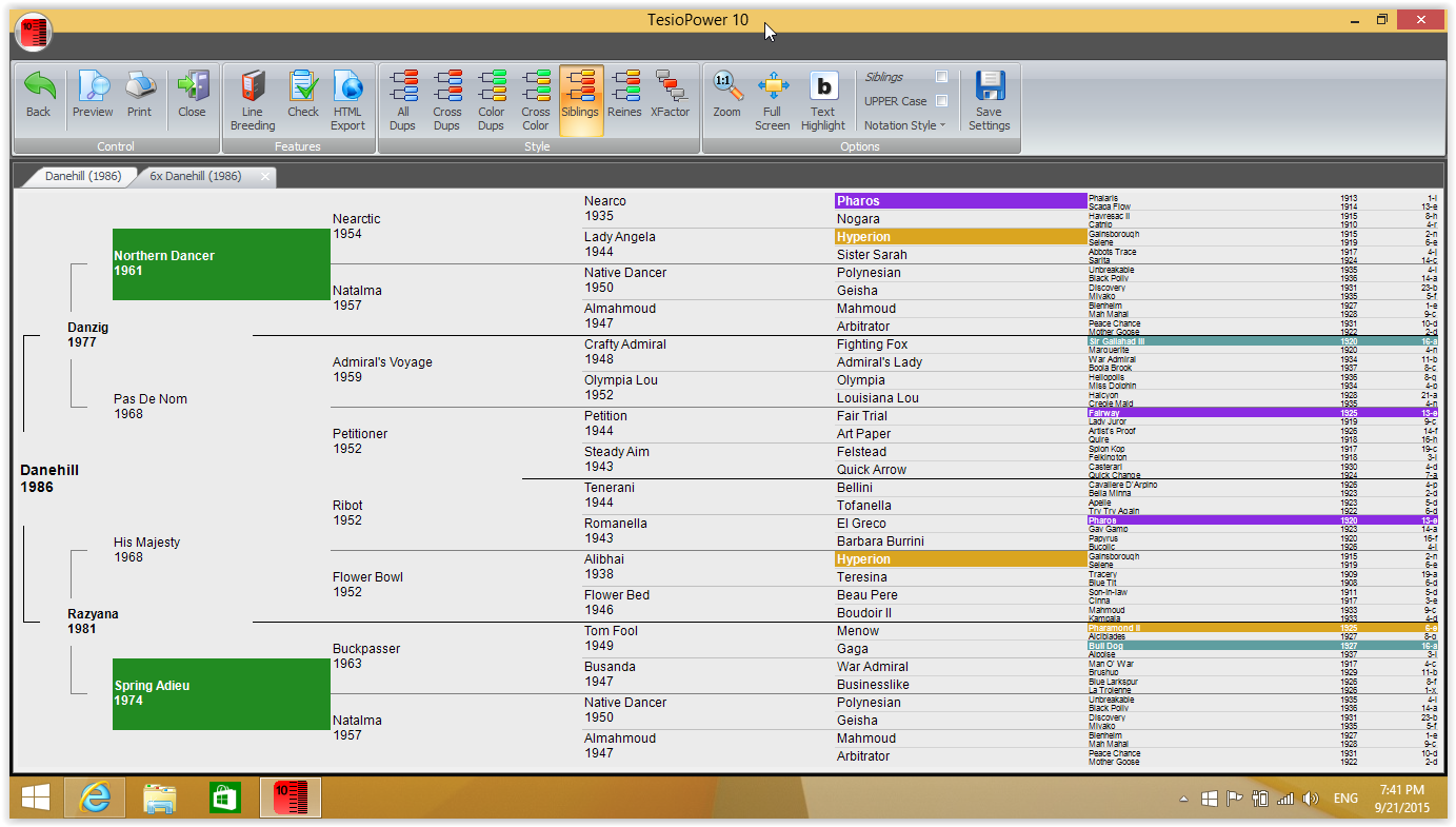 最后要附上的是Tesio,这是一个付费软件,页面颜色表达比较清晰,这一点我很喜欢。Tesio软件和上面网站的血统图显示和分析方法都很好用,区别在于,网站可以随时上去看最新信息,而Tesio是软件,更新速度比较慢。如果想随时看到血统信息,固然是网站更好,如果想不上网也能用以往下载的资料做分析,就是Tesio更好!