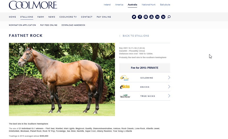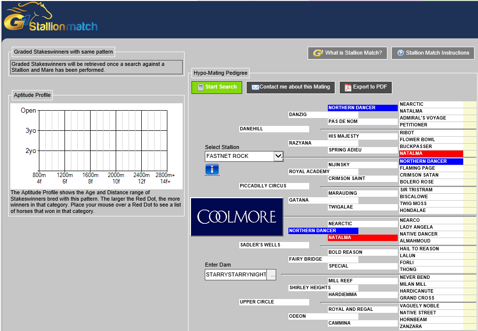 这例子是Coolmore网站提供的免费Goldmine软件,如果拿Fastnet Rock(基本是澳大利亚最贵的马公)和”快如疾风“的马母Starrystarrynight配合。。。。。