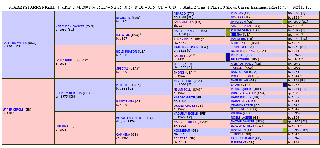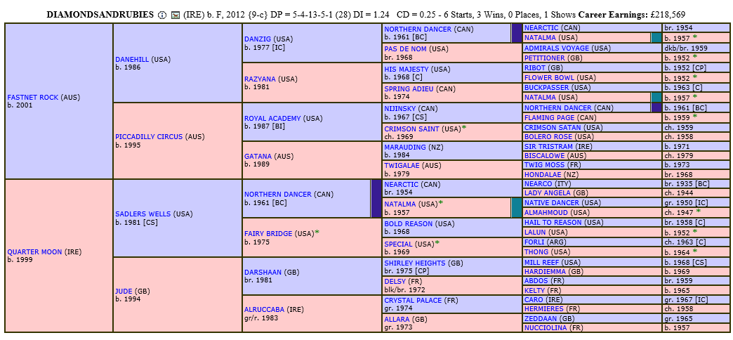 Starrystarrynight(”快如疾风“的母亲) 跟 Diamondsandrubies马母的血统很像,如果按几率这个血统成功的机会可能比一般Sadler's Wells还要高,因为还有Shirley Heights,所以Goldmine出20/20也是预料中的结果。