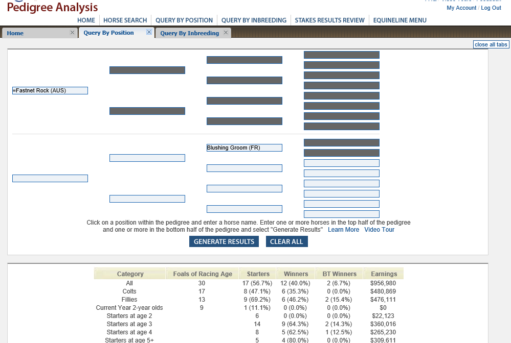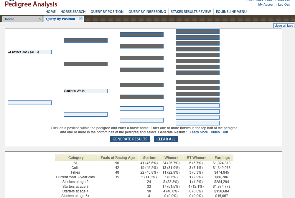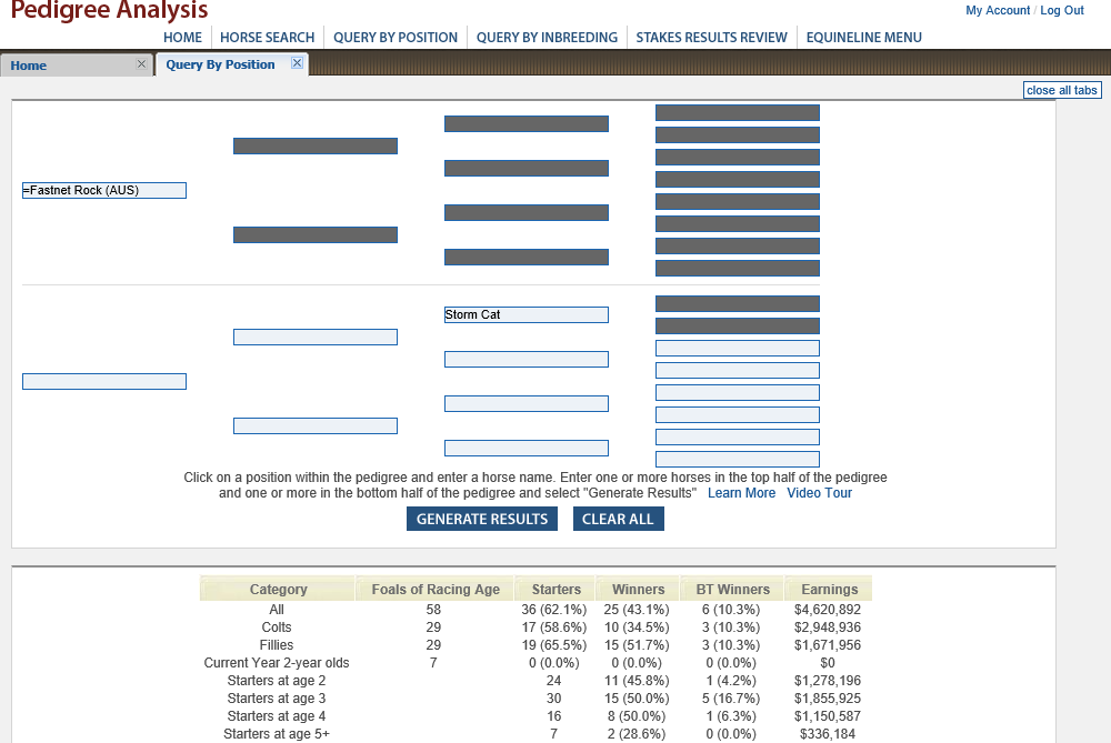 Equineline的数据记录非常广泛全面,差不多所有世界上的马匹资料都存有,你可以从多方面去分析马匹纪录和血统,比如说你想买任何马公的后代,你可以拿到那马公所有的配种纪录,拿到这些纪录,你可以下一步详细分析有没有启示,图案/模式,指引。不但马公,马乸家族,马乸配种过往所有记录都有。而且这软件是客户可以随时上网用到(不过记得下载备份,因为是每次都收费!),下载的东西大部分要收费,但是如果你要求的是级赛成绩,我觉得花费点金钱也是需要的,从这些很多的数据,如果你加上时间和工夫,很多时候是有宝贵的效应。我附上Equineline的pedigree analysis血统分析页面,你可以看到有好几个用途,比如之前看过的祖先Inbreeding数据,还有就是血统分析,特别是'位置’血统分析,他们提供4代的,但是如果要测试更加后的,只要你懂得运用,也可以得到很多重要启示:
