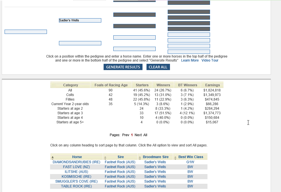 所以现在要讲的就是看数据,市面上有很多给数据的公司,软件产品,像True Nicks,eNicks, Werkhorse等等的都是看看那个马公的父线跟那个马乸的父线配合,这很普遍,但是我觉得不够彻底!特别是一些没有给尝试过的配合,往往结果是很低级的,所以用这样的数据分析,要很小心!我觉得还是要看整体马公/马母合起来后代的血统,之前说了很多,而且是某程度上可以解析的,现在介绍一个数据软件,是G1 Goldmine,这血统软件是很全面的,而且很多推广马公的牧场都免费提供他们马公的数据,而且这数据是简化我自己看血统的方法,如果你怕要做很多深入功课,用这软件也很有效,而且如果配合的血统是20/20满分,牧场也愿意给你配种优惠!(但是一些没有明显4代内的复制,这软件是会错过的,有机会我会拿我一匹配种的What a Winter/Queen of the Sky的配种图解析,4代内完全没有复制,但是后面的配合是难得的!这马仔今年刚生出来,看看几年后是不是很厉害!)