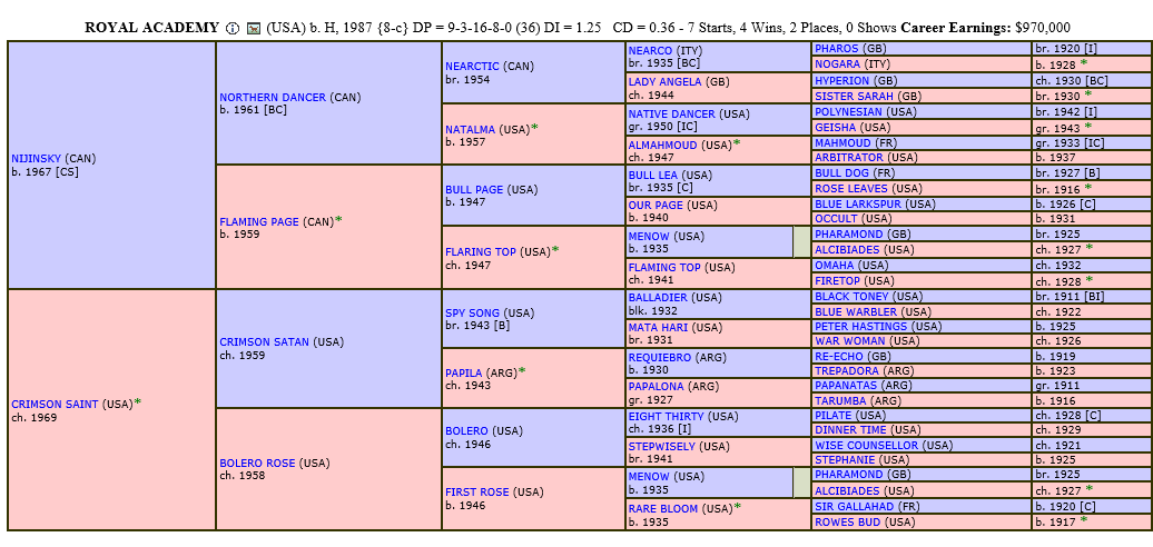 我不同意这种说法,我着重遗传祖先的“Hotspot/热点”。马匹遗传了的能力,同时遗传性能高的,就可以称为Hotspot/热点(为什么要用‘热点’来形容,因为有时候,应该说大部分时候,那‘祖先’能力是没有被遗传下去,就是血统图里面有,也不代表遗传‘成功’,所以要用很多数据,经验来判断)。特别是遗传能力高的一些祖先,就是如果马公血统内的祖先很明显是遗传了,我们就不必再想遗传了多少能力,而是集中这祖先作为”攻击点“!这可以在很多明显的例子看到!因为现在马公交配很多马乸(如果是热门南北球配种的可能一年就配种上三四百匹马乸),往往有明显的线索!如果用上一些数据软件复查纪录,可以看到这些效果,同时可以数据化来分析和比较!(数据软件只提供四代位置分析,如果超过四代后,那我们可以用估计的proxy/代替者来分析,就等于Nureyev是Special的儿子和proxy,又或者下面举的例子,查不到Crimson Saint的4代数据,可以用上Storm Cat/Royal Academy来查,所以Crimson Saint在再后的代数,但是还要自己眼光经验来判断)。