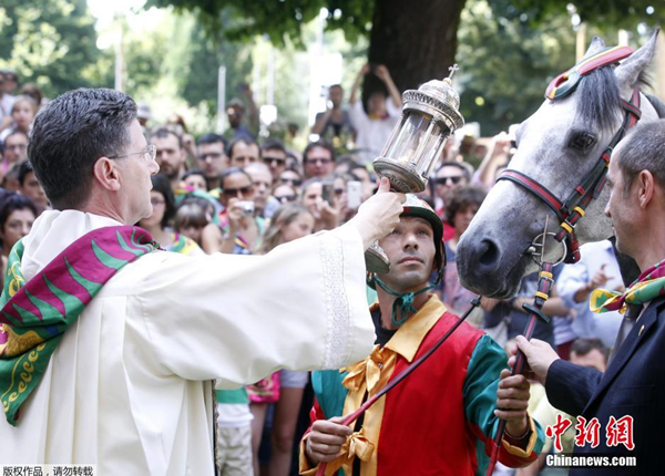 当地时间2014年7月2日,意大利锡耶纳,一年一度的锡耶纳赛马节开幕。赛马节在锡耶纳的田野广场举行,来自各个街区的骑士一律不备马鞍,比赛场面极其惊心动魄,每年都会吸引大批世界各地的观众前来观看。