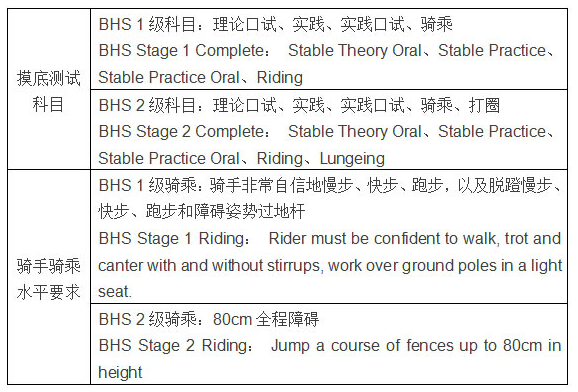 主测试官将根据英国马会BHS考试大纲要求,针对1级(4个科目)、2级(5个科目)分别进行考核。