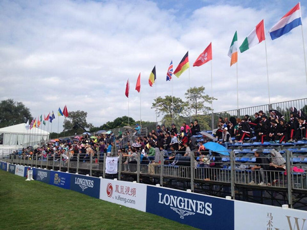 广州今天的天气非常地怡人,气温较昨天略有升高,温和的阳光洒满了绿茵场,今天的黄村体育训练基地就像是披上了一层金灿灿的薄纱。不管是VIP区域还是普通看台,比赛现场座无虚席,晴好天气和观众的热情给骑手和马儿助力不少。