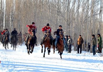 当天下午,活动还未开始,村民们就早早等候在村委会前的空旷地。随着裁判一声令下,15匹马争先恐后地奔跑起来,骑手们风驰电掣般驰骋赛场,激烈的赛马场面让围观群众忘记了寒冷,不住地为赛手呐喊助威。3圈过后,村民依明·尼亚孜获得10公里速度赛马第一名,他对记者说,能获得第一名太开心了,希望村里多举办这样的文体活动。