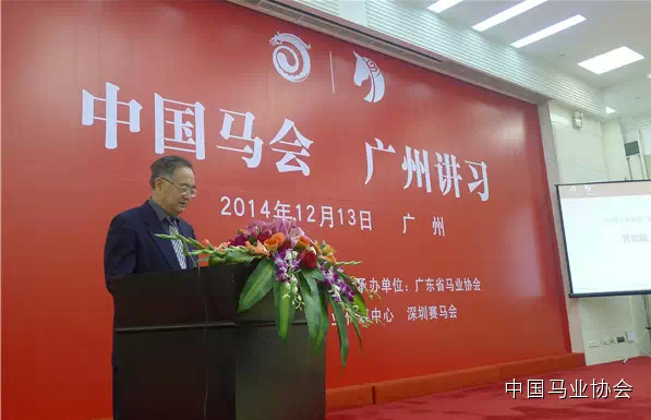 20141213日,“中国马会 广州讲习”在广州市珠岛宾馆成功举办。来自全国各地的一百五十余名马业专家、学者齐聚一堂,共商马业发展大计。中国马业协会理事长贾幼陵,中国马业协会常务理事、农业部畜牧业司副司长王俊勋,中国马业协会副理事长、内蒙古马业协会理事长乌兰巴特尔等领导出席活动。