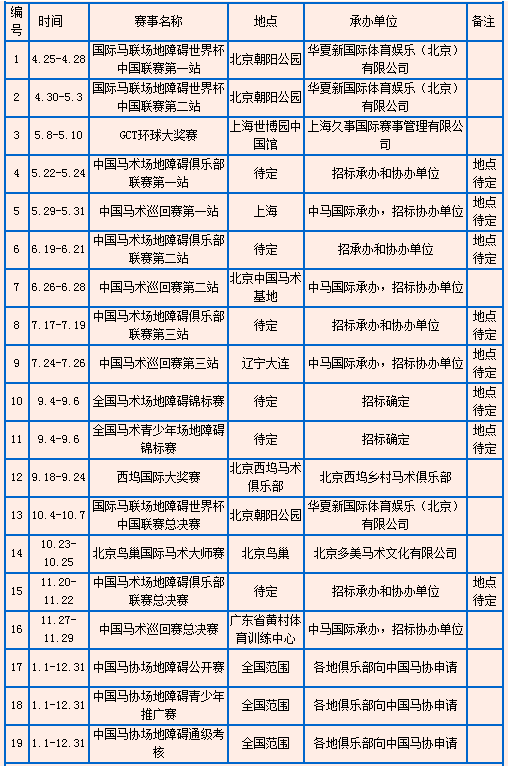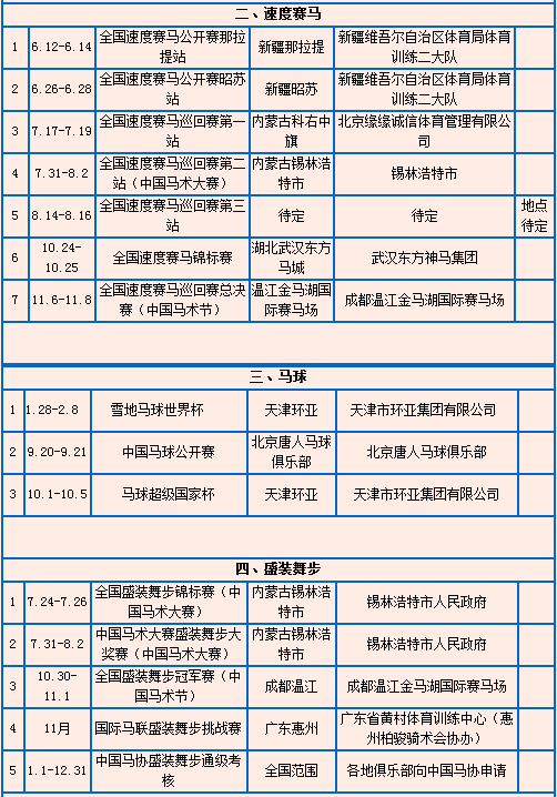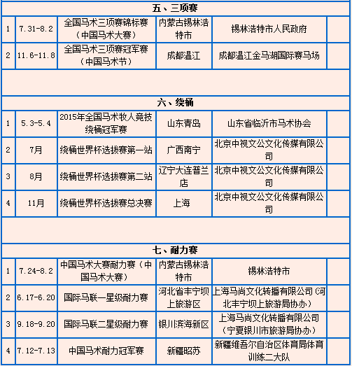 1月14日,中国马协发布了2015年全国马术项目赛事计划。从赛程上看,全国马术,速度赛马及马球等赛事共44场,较去年的34场整整多出十场比赛。赛事门槛方面,有意降低盛装舞步的门槛,从而打破盛装舞步则因门槛高而发展较慢的局面。