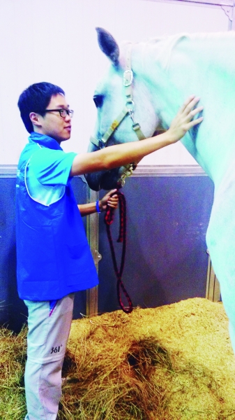 刘骦今年27岁,从事马匹的兽医工作已有4年多,这次他护送38匹赛马从北京来到南京新庄的马术馆。这几个月来他每天10多个小时都与马待在一起,对每一匹赛马的脾气了如指掌,已经和赛马成了好朋友。