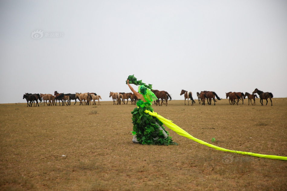 7月20日,绘画创作之余,按照纪录片导演的安排,艺术家孔宁身穿自制的“萨如拉叶子”婚纱作品在内蒙大草原上追逐蒙古马。