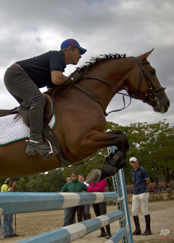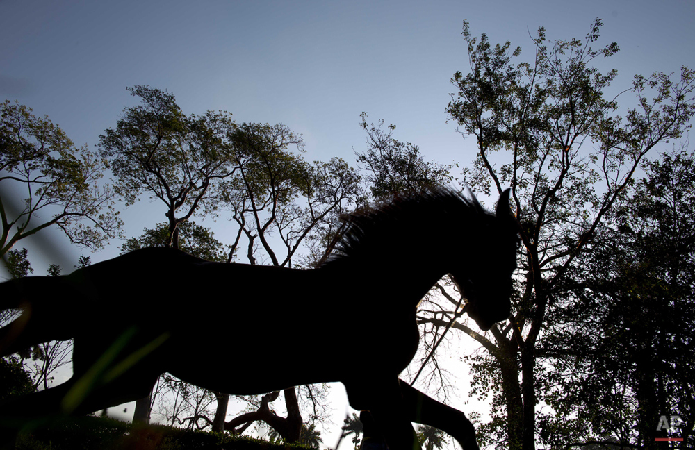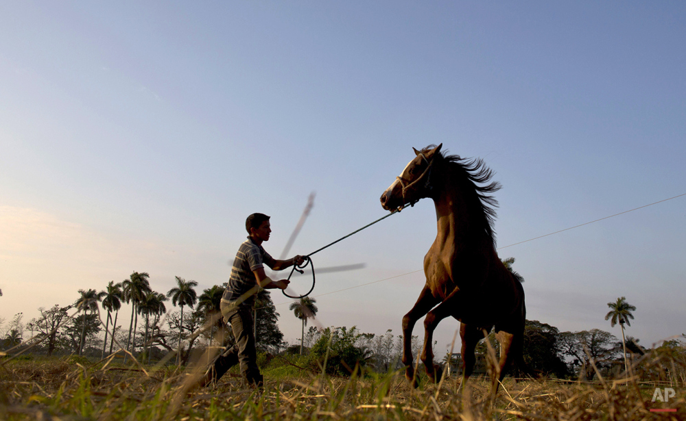 一个男子在古巴阿特米萨Azucarero国有牧场内训练赛马。赛马已经成为继朗姆酒和高档雪茄之后,古巴第三种闻名于世的奢侈品。一匹血统纯正的优秀赛马往往能拍出数十万人民币的高价。