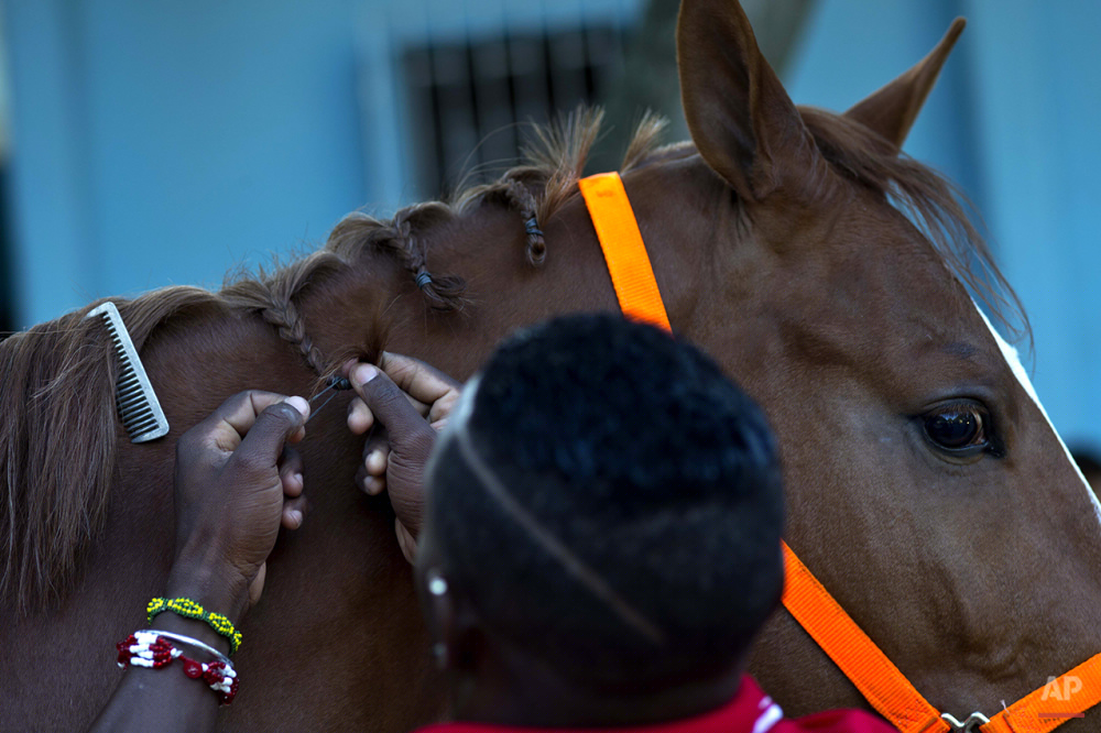 一场拍卖会开始之前,一位驯马师为他的爱马梳起小辫。