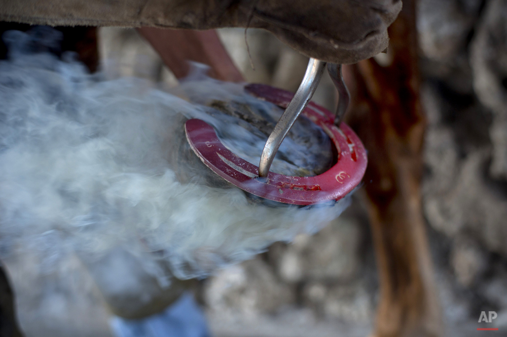 在古巴国家马术俱乐部内,一个铁匠在为赛马钉马掌。